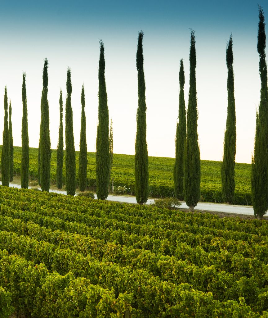 Viale di cipressi con vigneto